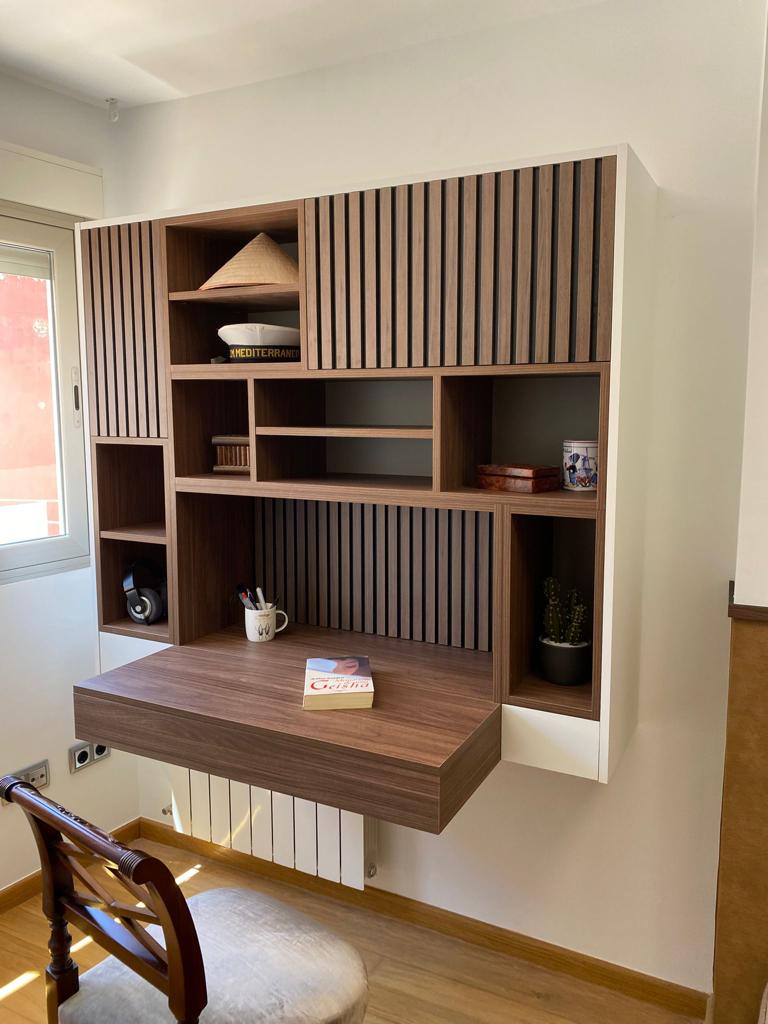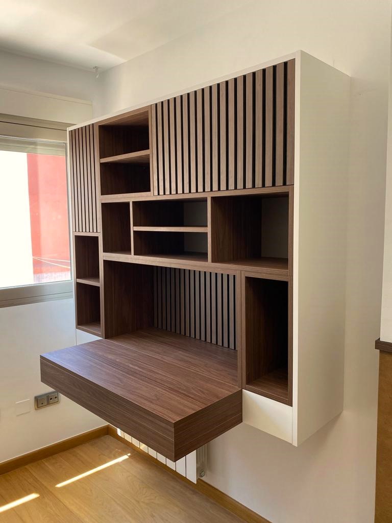 Con esas premisas nos pusimos manos a la obra y diseñamos el escritorio que ves. Un mosaico de compartimentos pensados para almacenar distintos objetos y un cajón bajo la encimera que completa la capacidad de almacenaje.